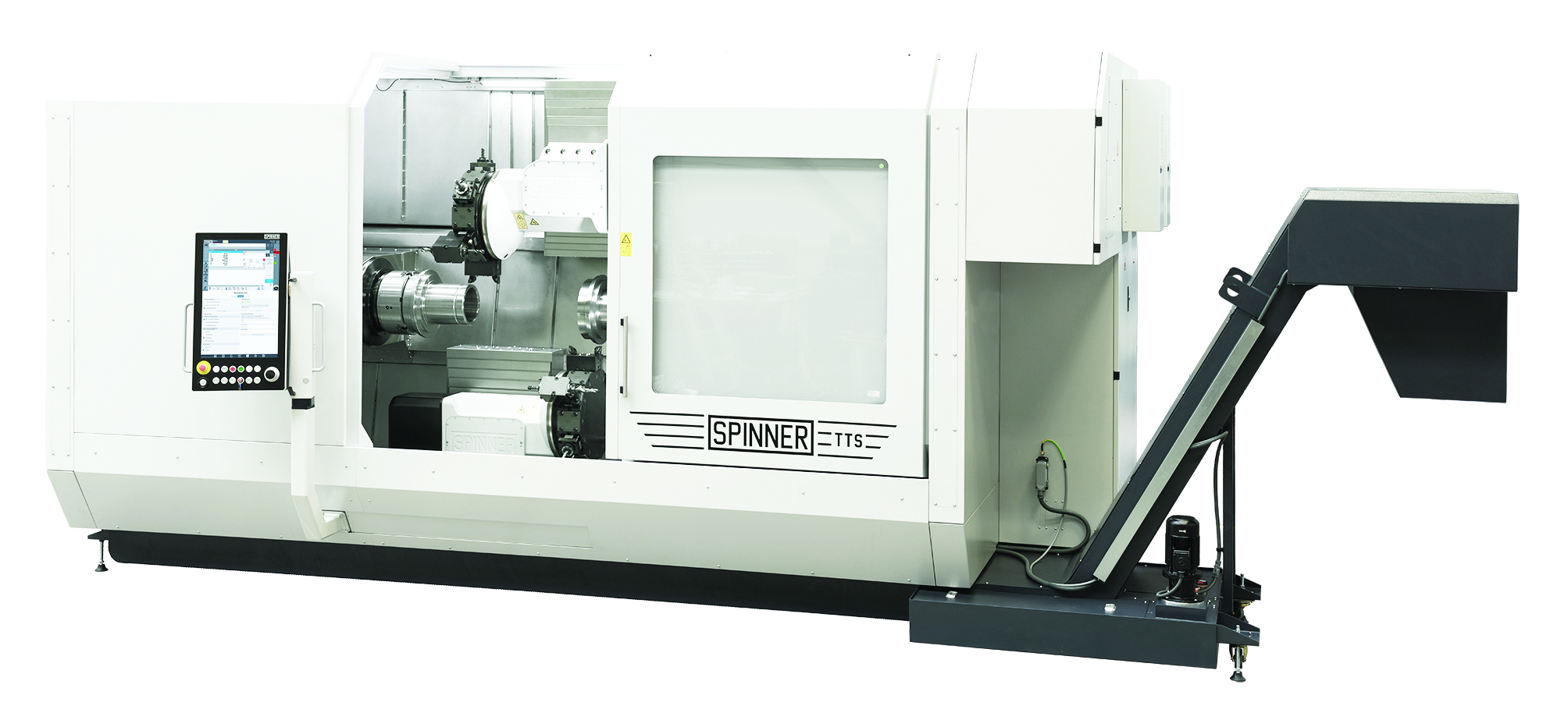 The TTS-85/125 is a high-performance multi-turret turning center for simultaneous machining for medium and high volume turning of large, long workpieces with up to four independent high-speed servo driven turrets made by Spinner. All turrets operate independently on the main or counter-spindle or can work on one spindle at the same time if desired.