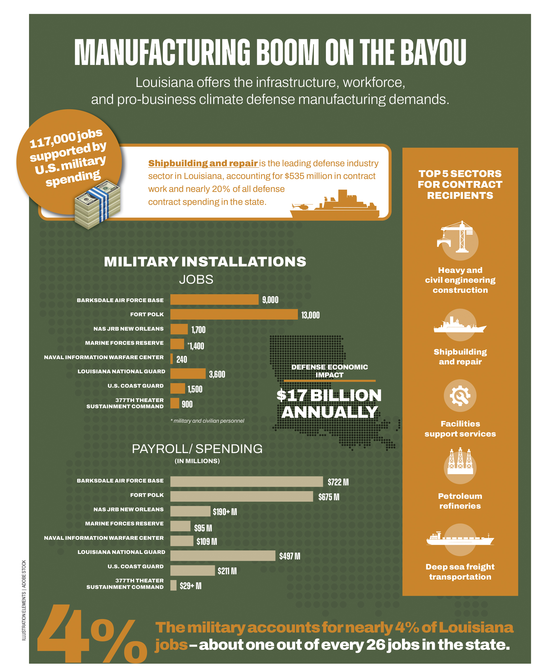 The military accounts for nearly 4% of Louisiana jobs – about one out of every 26 jobs in the state.