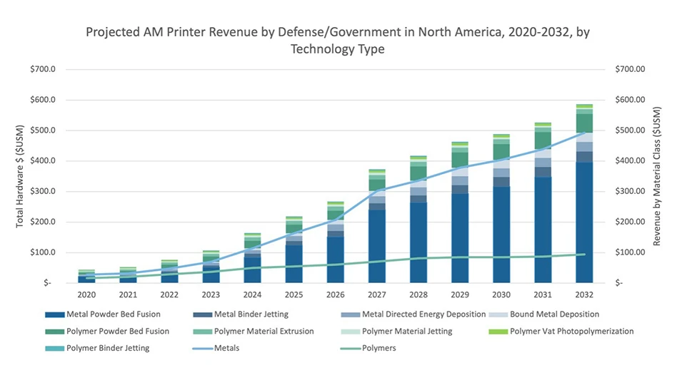 The report considers the United States Department of Defense 2024 budget and features an Excel-based market sizing and forecasting for all leading types of 3D printing, including Powder Bed Fusion, Directed Energy Deposition, Metal Binder Jetting and Bound Metal Deposition. The report considers revenues derived from hardware, materials, and printing services for both the polymer and metal additive manufacturing markets.