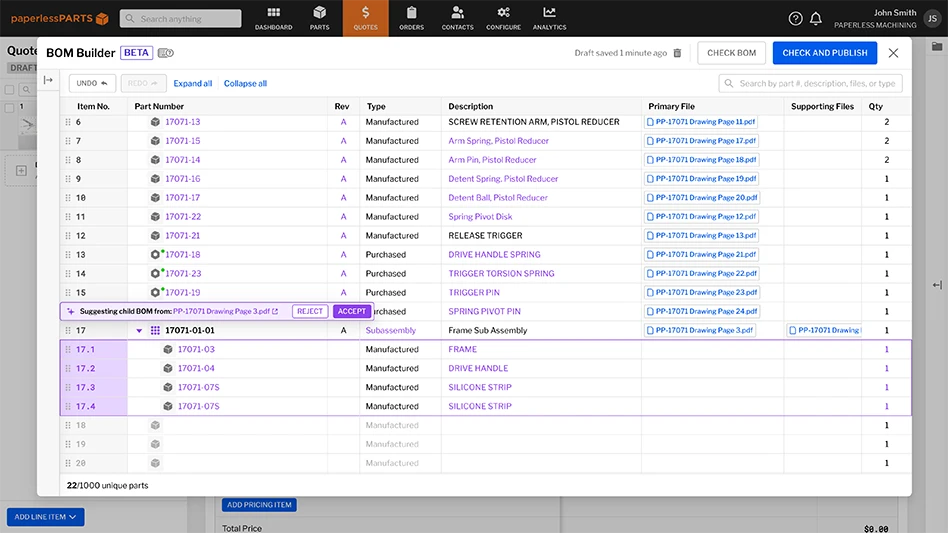 Paperless Parts, the leading quoting and collaboration platform for custom part manufacturers, announced the general availability of its new BOM Builder, the most powerful feature release in company history. The BOM Builder transforms the process of building out the bills of materials (BOMs) for complex assemblies, making it fast, intuitive, and secure—even when RFQ packages only include 2D drawings.